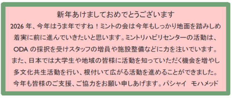 イランのミントリハビリテーションセンターが1週年を迎えることができ、障害者、家族、地域、行政が一体となる拠点ができ活気があります。今年もたくさんの応援をよろしくお願いいたします。